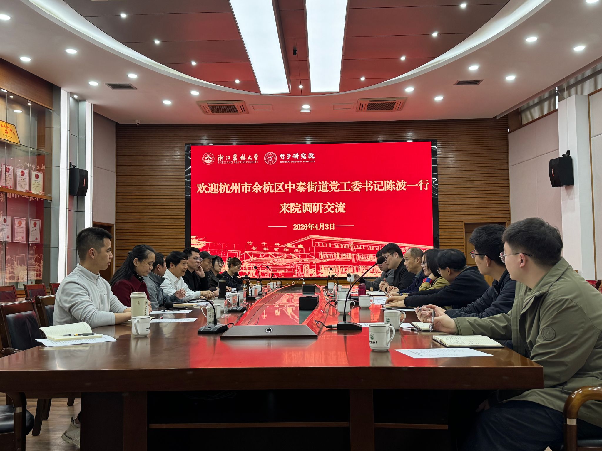 4月3日下午,杭州市余杭区中泰街道党工委书记陈波一行来竹子研究院调研交流。竹子研究院名誉院长方伟教授参加交流,交流会由竹子研究院党总支书记周能寿主持。