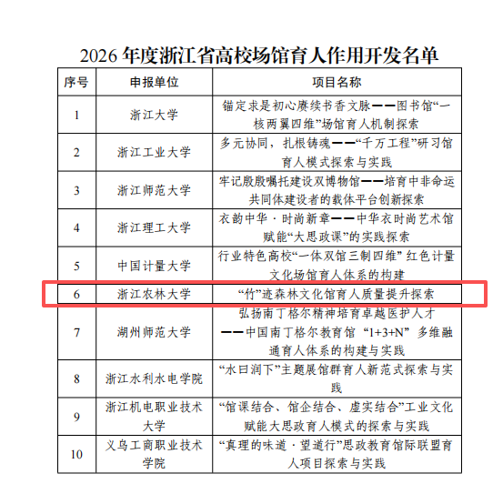 近日,浙江省教育厅办公室正式公布2026年度高校思想政治工作质量提升综合改革与精品建设项目立项结果,我院申报的《“竹”迹森林文化馆育人质量提升探索》成功入选高校场馆育人作用开发类省高校思想政治工作精品建设项目,标志着我院思想政治教育工作取得标志性突破。